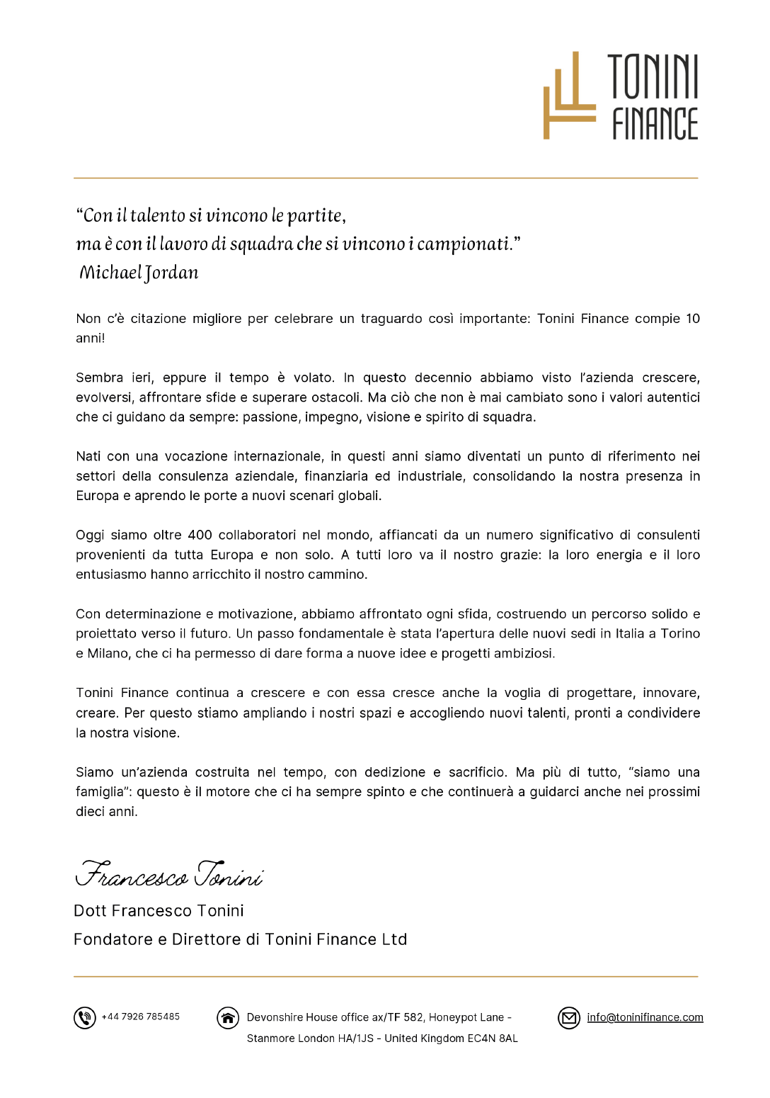 Tonini Finance was founded on the vision of Dr Francesco Tonini, economist and strategic advisor with extensive experience across both public and private sectors..